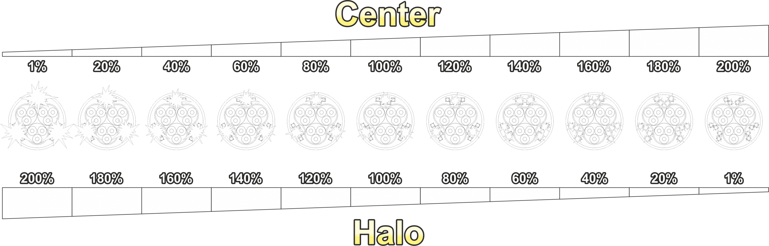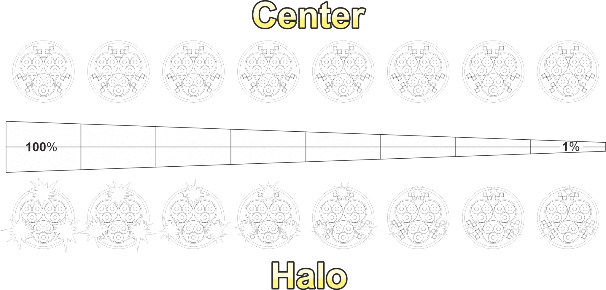 ⇓ Розподіл потужності світіння ліхтаря HPL-4 V4, перелив між Центром і Ореолом.